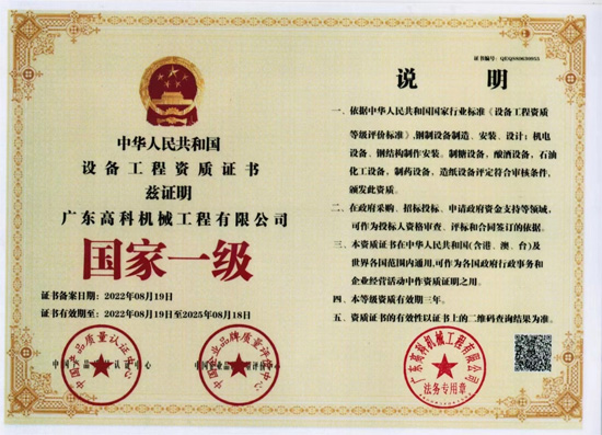 名 稱:設備工程資質證書